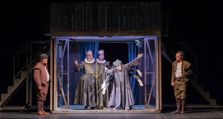 Questa versione ridotta e snella, che si presenta come un atto unico, mantiene intatte le reali intenzioni di commedia e riflessione di Stoppard, avvalendosi di un allestimento di grande impatto. Le scene di Luigi Ferrigno si ispirano alla tradizione della Commedia dell’Arte, con una fatiscente baracca in legno al centro del palco che si apre rivelando un doppio ambiente su due livelli. L’epoca rinascimentale è richiamata anche dai pregiati e colorati costumi storici.